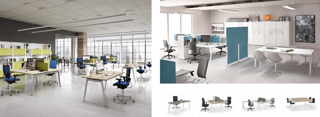 Strutture in metallo per tavoli collaborativi su due livelli, disponibili con altezza fissa.