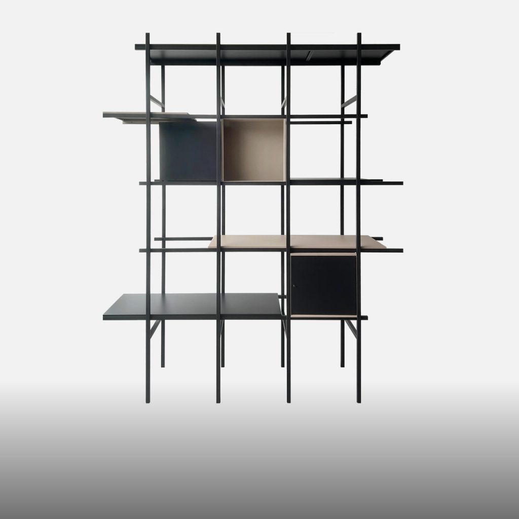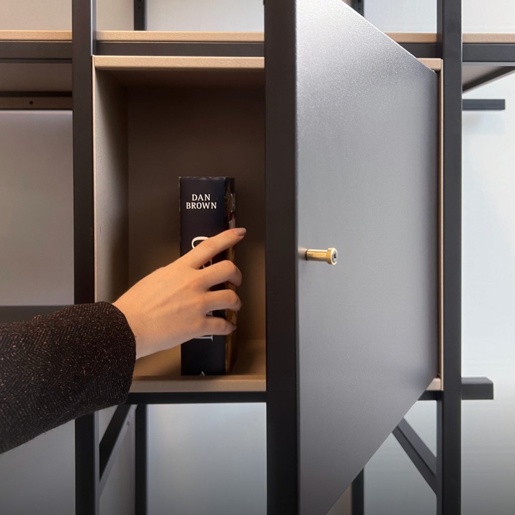 Interamente in metallo, quetsa libreria può essere personalizzata a piacimento,  perché i suoi cubotti e scaffali possono essere posizionati ovunque nella struttura.